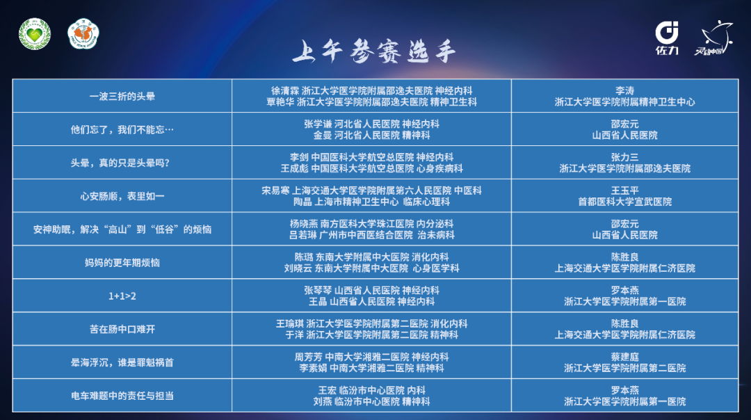 灵动中国半决赛特邀苏州大学附属第一医院吴爱勤教授、浙江大学医学院附属精神卫生中心李涛教授担任上半场的大会主席,东南大学附属中大医院袁勇贵教授和浙江大学医学院附属邵逸夫医院陈炜教授担任下半场大会主席,邀请首都医科大学宣武医院王玉平教授、山西省人民医院邵宏元教授、浙江大学医学院附属第一医院罗本燕教授、上海交通大学医学院附属仁济医院陈胜良教授、上海交通大学医学院附属仁济医院戴继灿教授、浙江大学医学院附属邵逸夫医院张力三教授、浙江大学医学院附属第二医院蔡建庭教授、北京大学人民医院丁荣晶教授、北京协和医院蒋子栋教授、浙江省立同德医院马彩艳教授和杭州市江干区四季青街道社区卫生服务中心汪泉教授担任点评嘉宾,由宁波市康宁医院的王禹博与浙江大学医学院附属邵逸夫医院的张雅雯担任主持,权威阵容共话“心身同治”,多学科碰撞共促领域发展。